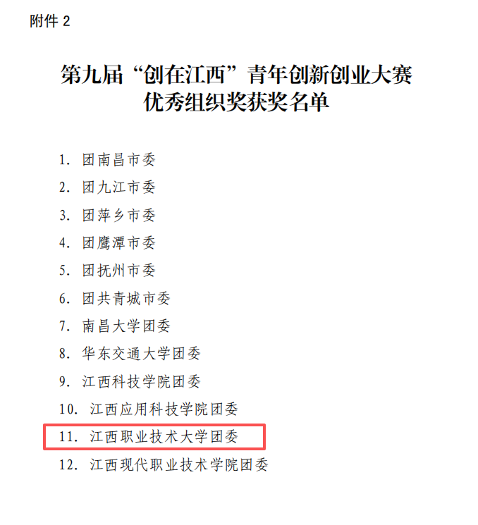 11月26日,第九届“创在江西”青年创新创业大赛暨青创项目助力“1269”行动计划交流活动终审决赛在共青城市举行,我校选送的7个项目分别荣获初创组银奖2项、铜奖2项、优秀奖1项,成长组铜奖1项、优秀奖1项,并获评优秀组织奖。