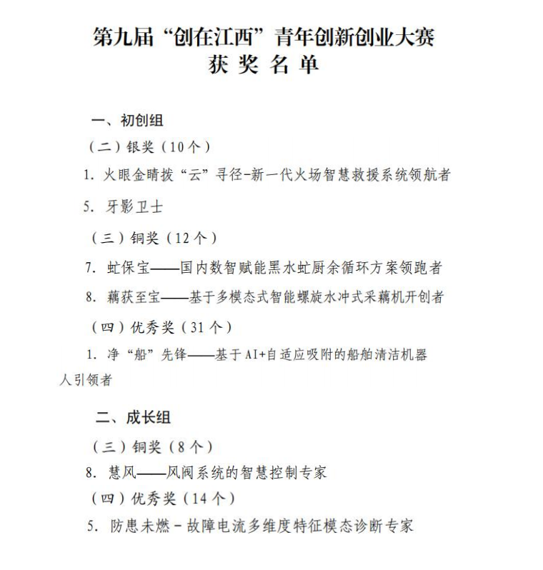 本届大赛自8月启动以来,在学校领导高度重视和关心指导下,校团委、创新创业学院精心组织,各二级学院积极参与,从项目培育到校赛选拔,从省赛备战到终审决赛,全程开展多轮专题培训和项目打磨。最终,我校7个项目在全省600余个项目中脱颖而出喜获佳绩,信息工程学院《火眼金睛拨“云”寻径-新一代火场智慧救援系统领航者》、电气工程学院《牙影卫士》2个项目获评初创组银奖;机械工程学院《虻保宝——国内数智赋能黑水虻厨余循环方案领跑者》《藕获至宝——基于多模态式智能螺旋水冲式采藕机开创者》2个项目获评初创组铜奖、汽车工程学院《净“船”先锋——基于AI+自适应吸附的船舶清洁机器人引领者》获评优秀奖;电气工程学院《慧风——风阀系统的智慧控制专家》《防患未燃-故障电流多维度特征模态诊断专家》2个项目分别获得成长组铜奖、优秀奖。