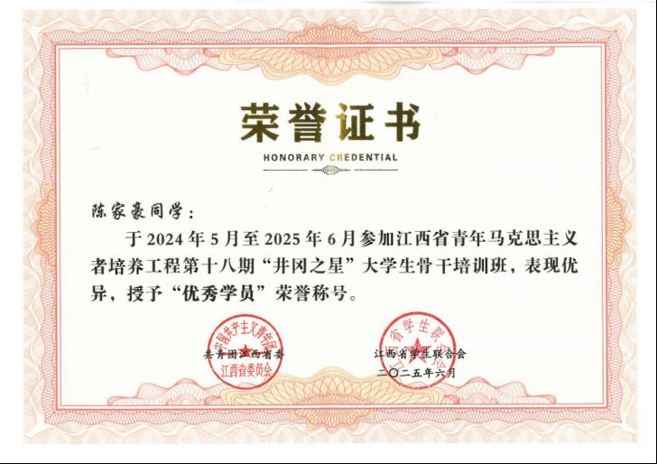 2025年6月,江西省青年马克思主义者培养工程第十八期“井冈之星”大学生骨干培训班在江西应用科技学院圆满结业。来自全省各高校的150余名学生骨干参加培训,我校团委学生副书记、经济管理学院京东物流2301班陈家豪同学顺利结业,并以优异表现从众多学员中脱颖而出,获评“优秀学员”称号。