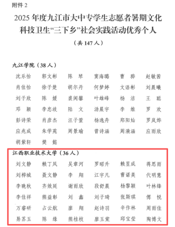 近日,中共九江市委宣传部、共青团九江市委、九江市教育局、九江市学生联合会联合印发了《关于2025年九江市大中专学生志愿者暑期文化科技卫生“三下乡”社会实践活动的通报》,我校获评优秀团队12项、优秀指导教师12项,优秀个人36项。