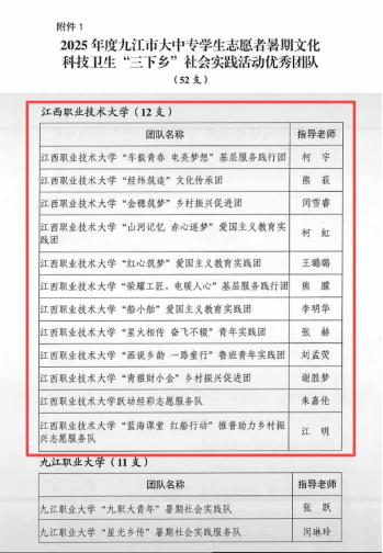 我校在2025年九江市大中专学生志愿者暑期“三下乡”社会实践活动中喜获佳绩